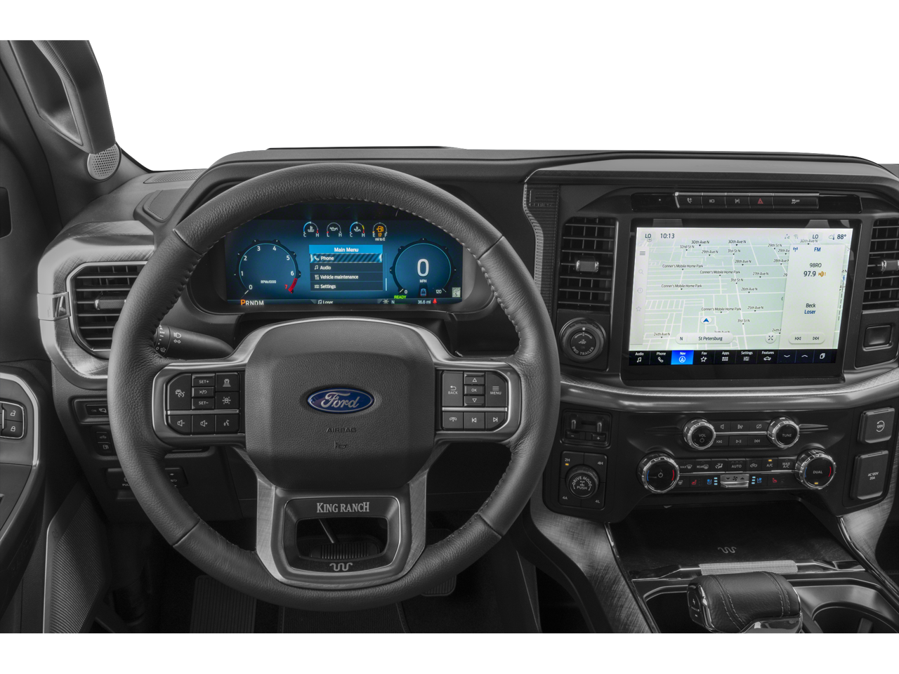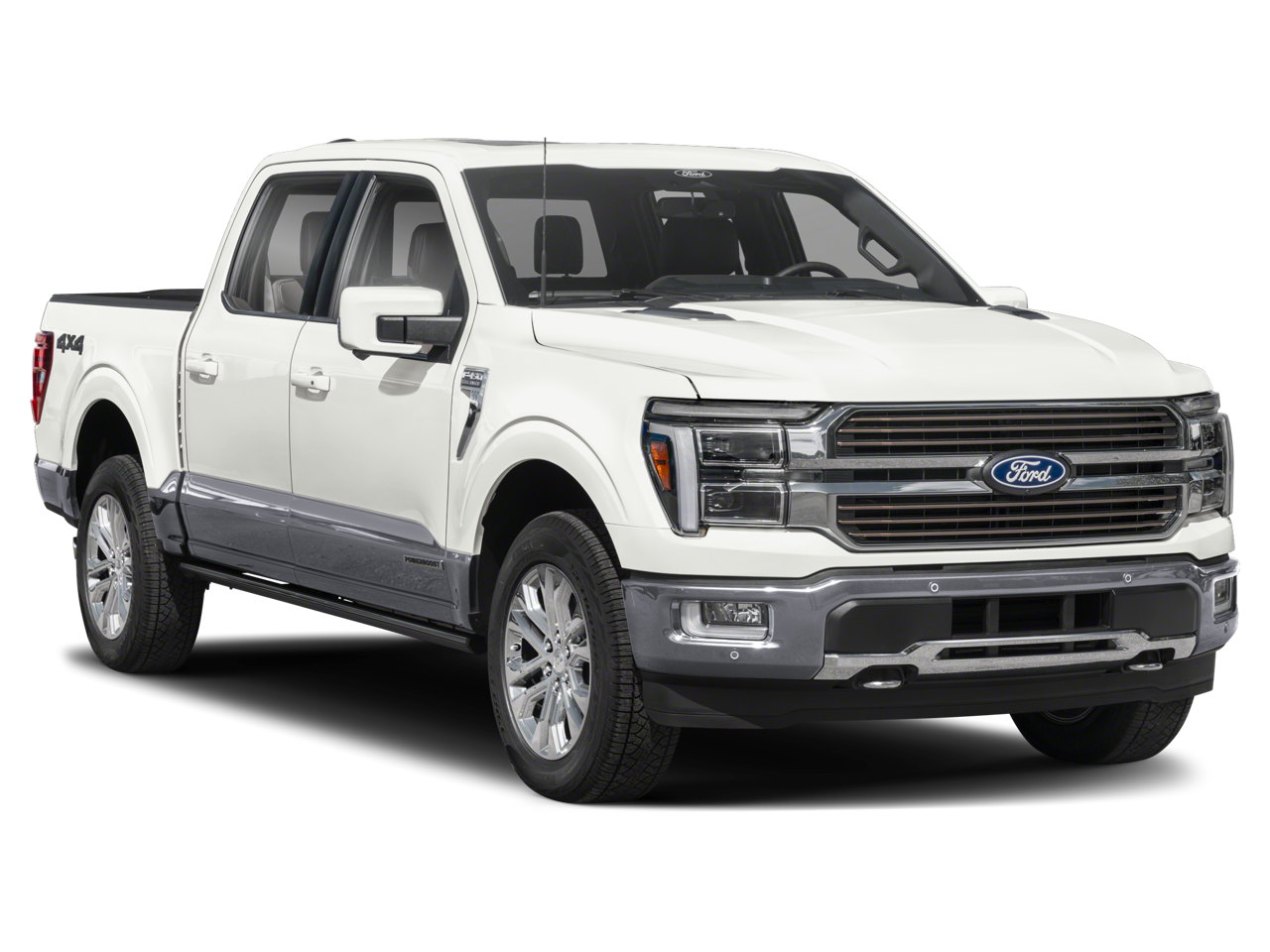 Equipment Group 601A High (Electronic Locking with 3.55 Axle Ratio and Wheels: 20 Chrome-Like PVD), Ford Connectivity Package (1-Year Included), Ford Connectivity Package (one-Time Purchase - 7 Years), FX4 Off-Road Package (4x4 FX4 Off-Road Bodyside Decal, Hill Descent Control, and Off-Road Tuned Front Shock Absorbers), GVWR: 7,400 lbs Payload Package, Internet access capable: 5G Modem - Ford Connectivity Package, 4WD, 4-Wheel Disc Brakes, 8 Speakers, ABS brakes, Adjustable pedals, Air Conditioning, Alloy wheels, AM/FM radio: SiriusXM with 360L, Auto High-beam Headlights, Auto tilt-away steering wheel, Auto-dimming door mirrors, Auto-dimming Rear-View mirror, Automatic temperature control, Brake assist, Chrome wheels, Compass, Delay-off headlights, Driver door bin, Driver vanity mirror, Driver's Side SecuriCode Keyless-Entry Keypad, Dual front impact airbags, Dual front side impact airbags, Electronic Stability Control, Emergency communication system: SYNC 4 911 Assist, Front anti-roll bar, Front Bucket Seats, Front Center Armrest, Front dual zone A/C, Front fog lights, Front reading lights, Front wheel independent suspension, Fully automatic headlights, Garage door transmitter, Genuine wood dashboard insert, Heated door mirrors, Heated front seats, Heated rear seats, Heated steering wheel, Illuminated entry, Leather steering wheel, Low tire pressure warning, Memory seat, Navigation system: Connected Navigation, Occupant sensing airbag, Outside temperature display, Overhead airbag, Overhead console, Panic alarm, Passenger door bin, Passenger vanity mirror, Pedal memory, Power door mirrors, Power driver seat, Power passenger seat, Power steering, Power windows, Pro Access Tailgate, Pro Power Onboard - 2KW, Radio data system, Radio: B&O Sound System by Bang and Olufsen, Rain sensing wipers, Rear reading lights, Rear seat center armrest, Rear step bumper, Rear window defroster, Remote keyless entry, Security system, Speed control, Split folding rear seat, Steering wheel memory, Steering wheel mounted audio controls, SYNC 4 with Enhanced Voice Recognition, Tachometer, Telescoping steering wheel, Tilt steering wheel, Traction control, Trip computer, Turn signal indicator mirrors, Twin Panel Moonroof, Variably intermittent wipers, and Ventilated front seats.